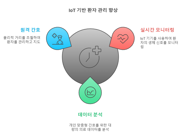 IoT 기기를 통해 환자의 생체 신호(심박수, 혈압, 체온 등)를 실시간으로 모니터링할 수 있습니다. 이는 간호사가 환자의 상태를 즉각적으로 파악하고, 긴급 상황에 신속히 대응할 수 있도록 도와줍니다.