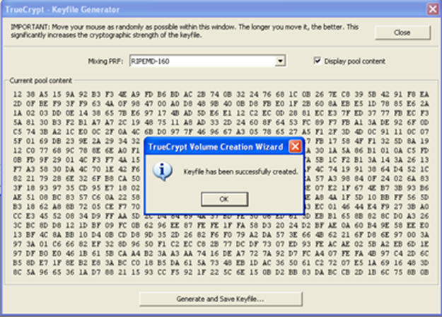 키 파일에 사용할 파일을 선택할 수 있습니다( 그림 7 참조 ). 또한, "임의 키 파일 생성..." 버튼을 클릭하면 원하는 키 파일을 직접 생성할 수 있습니다. "TrueCrypt 키 파일 생성기"가 나타납니다. "키 파일 생성 및 저장..." 버튼을 클릭하세요. 무작위로 생성된 키 파일을 하드 드라이브의 임시 파일에 저장하세요. 저장이 완료되면 확인 창이 나타납니다( 그림 8 ).