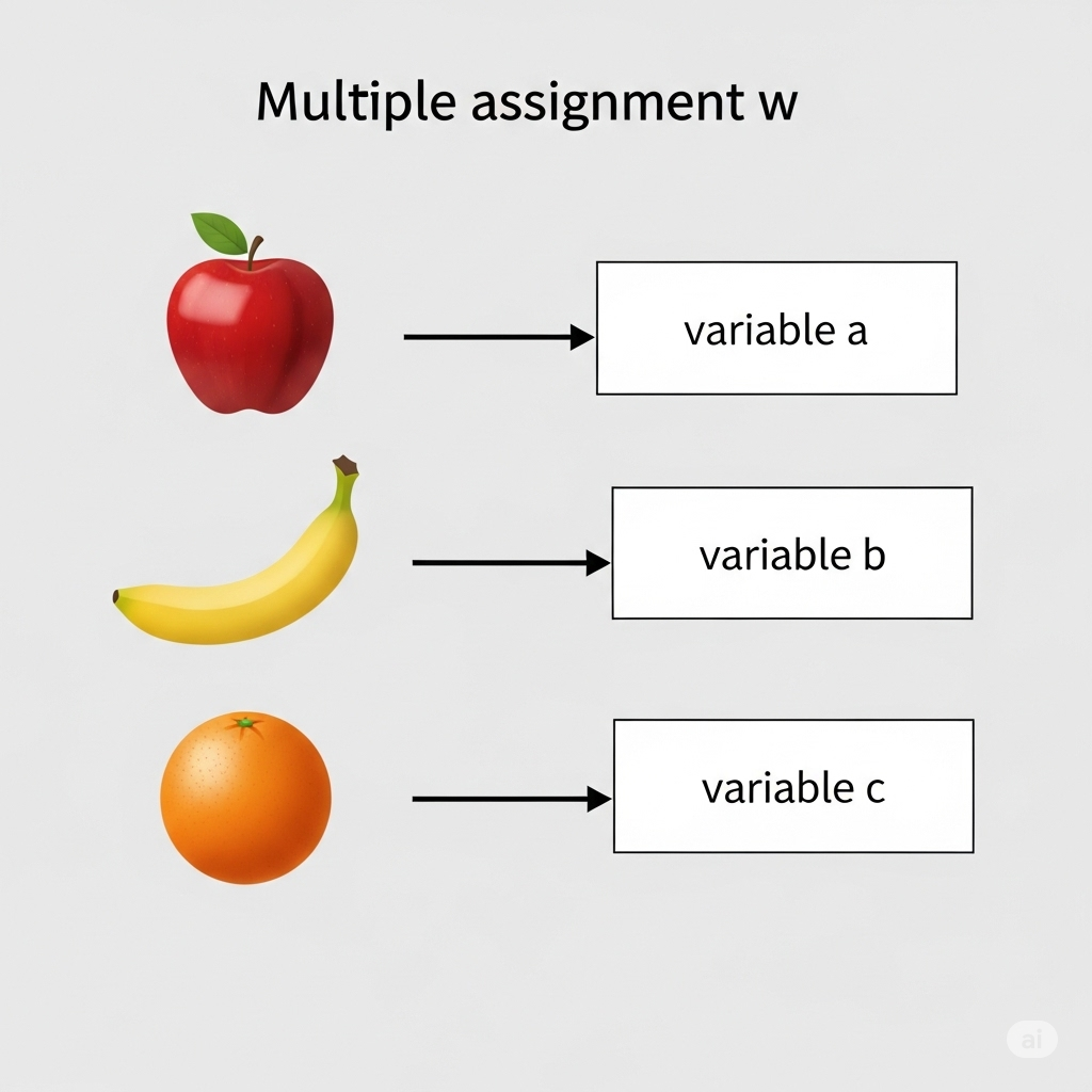 다중 할당은 여러 물건을 여러 상자에 동시에 담는 것과 같아요.